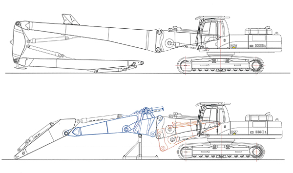 CAT336DL(EL)フック式ジョイントブームをベースに取り付け可能な2ピースブーム。