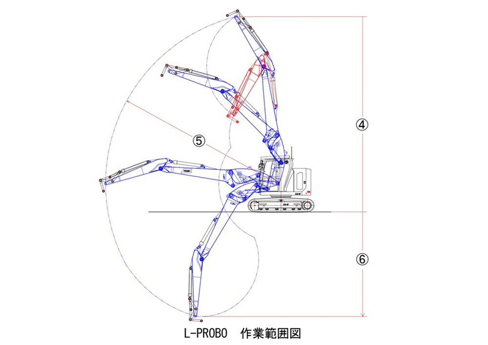 プロボシステムは2ndブームの作動ピンが支点ピンより後方に位置させることによりプロボシリンダーの保持能力をフルに使う事ができ、掘削時のシリンダーが伸びる現象を防止し掘削力を維持します。また、プロボシリンダーを1stブームに格納することによりブーム下の懐スペースを確保、狭い場所での周辺の建造物・鉄筋等への接触をガードします。