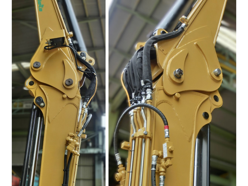 パレッタはブーム曲がり角度を2段階に変更できるミニショベル用2ポジションブームです。高所作業等の高さが必要な際にはストレートポジション、掘削等の通常作業時にはベントポジションに現場で簡単に変更できます。現場作業員によるピンの抜き替えだけでポジションの変更ができる便利なシステムです。